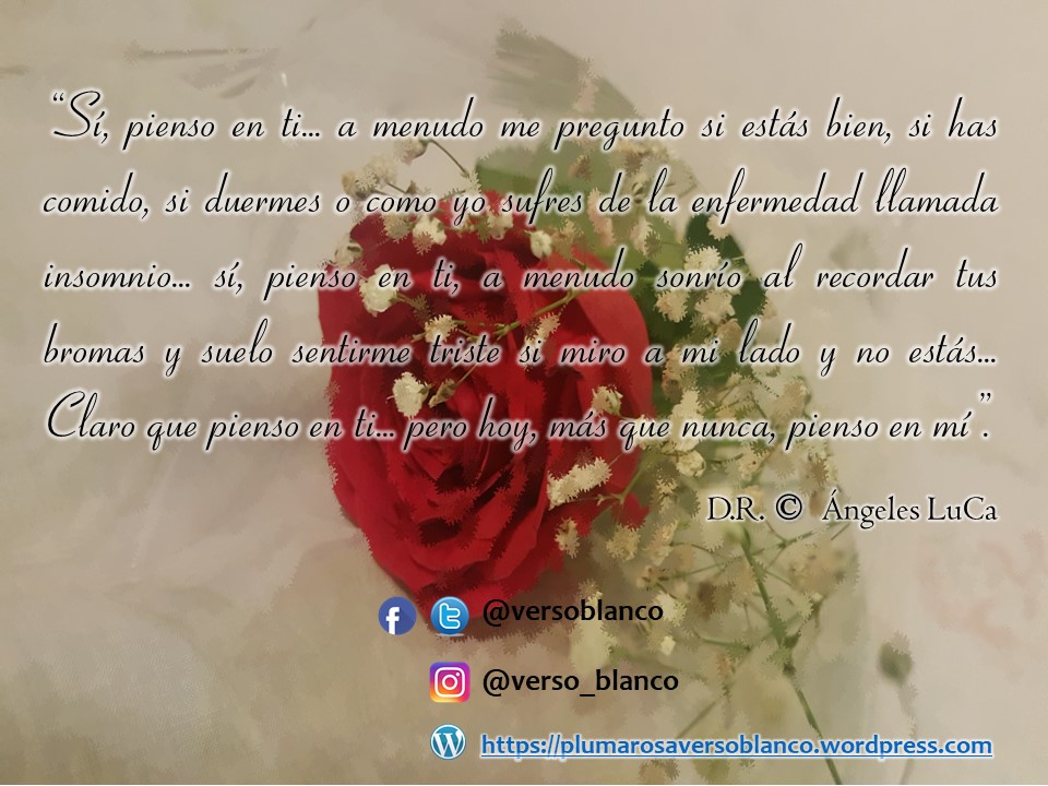 «Sí, pienso en ti… a menudo me pregunto si estás bien, si has comido, si duermes o como yo sufres de la enfermedad llamada insomnio… sí, pienso en ti, a menudo sonrío al recordar tus bromas y suelo sentirme triste si miro a mi lado y no estás… Claro que pienso en ti… pero hoy, más que nunca, pienso en mí.»